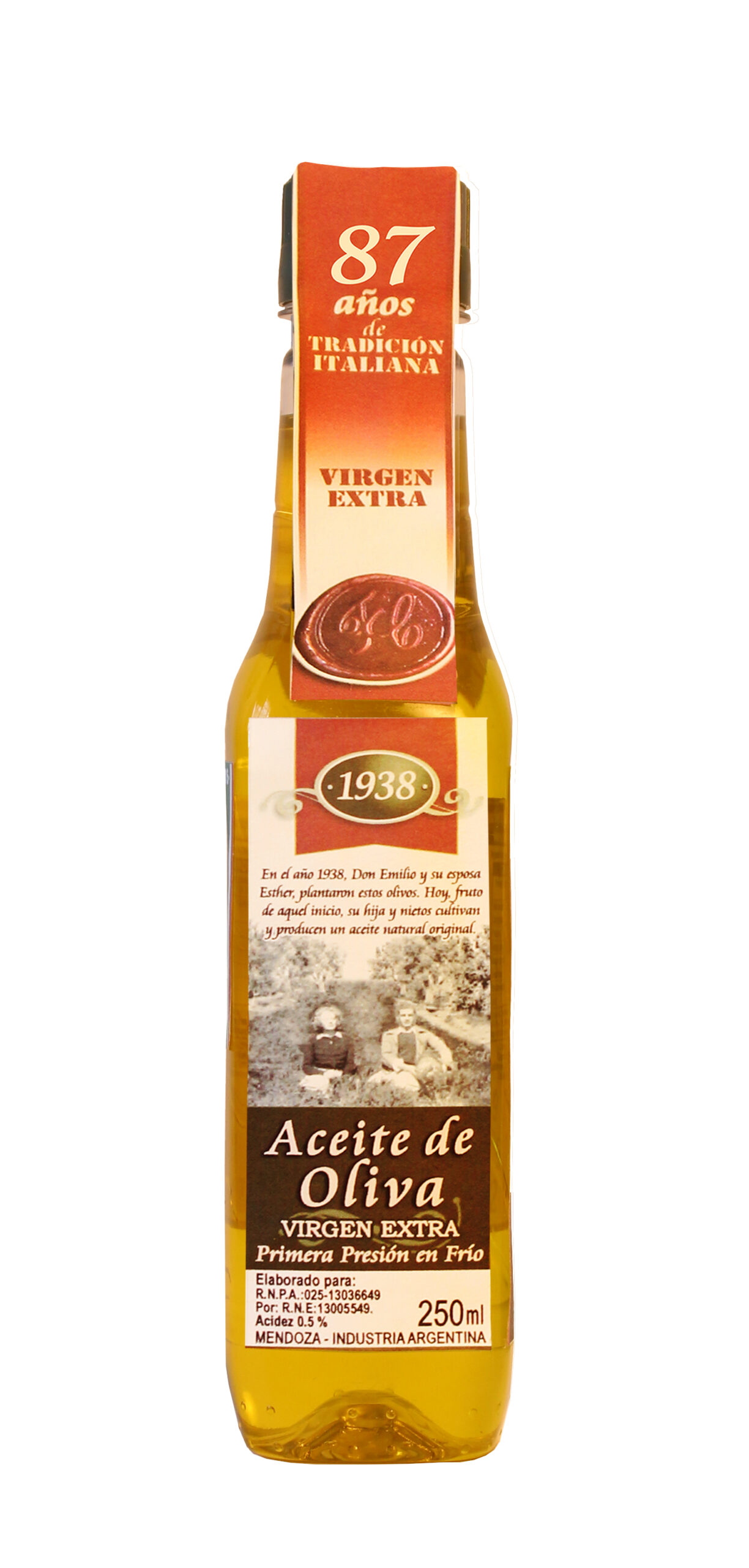 Aceite de oliva virgen extra 1938. Prensado en frío. Origen Mendoza. Descripción neutra para editar.